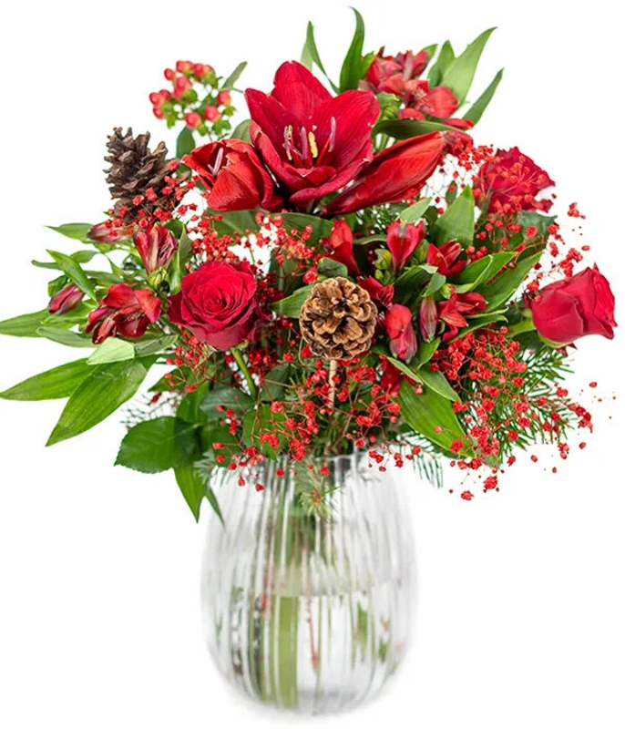 Bring the charm and warmth of Christmas into your loved one's home with our Festive Pines & Petals bouquet. Featuring radiant red roses, alstroemeria, hypericum, vibrant amaryllis, and touches of seasonal greenery.