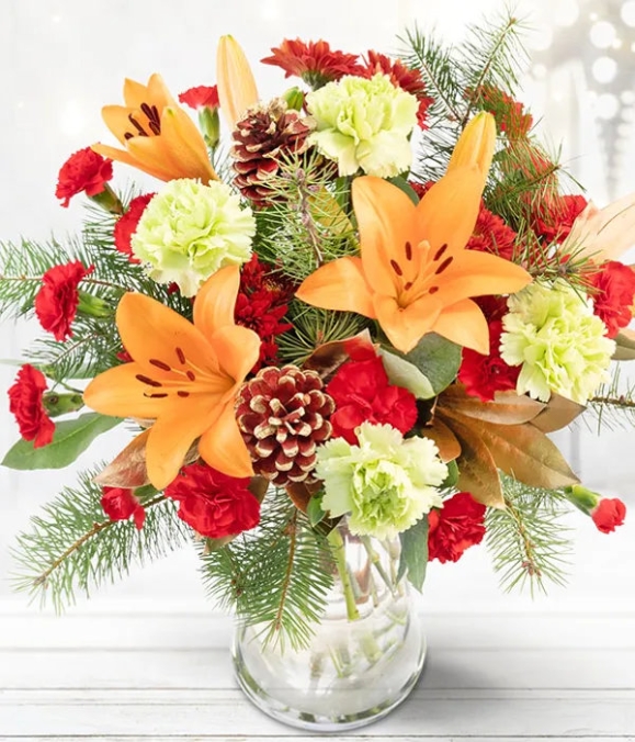 A bouquet filled with orange lilies, green carnation, chrysanthemum and a selection of festive gold and green foliages